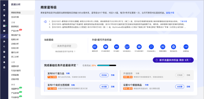 為了幫助新商家更快熟悉平臺(tái)規(guī)則、了解平臺(tái)運(yùn)營(yíng)方法、快速成長(zhǎng)為星級(jí)商家,商家星等級(jí)將近一步細(xì)分商家成長(zhǎng)階段,鼓勵(lì)新商家通過(guò)完成“新手推薦任務(wù)”做好建站的基本準(zhǔn)備,新店鋪加速啟動(dòng),為店鋪經(jīng)營(yíng)和升星建立更好的運(yùn)營(yíng)基礎(chǔ)。商家星等級(jí)評(píng)定開(kāi)啟節(jié)點(diǎn)變更于2022年5月6日正式上線生效。